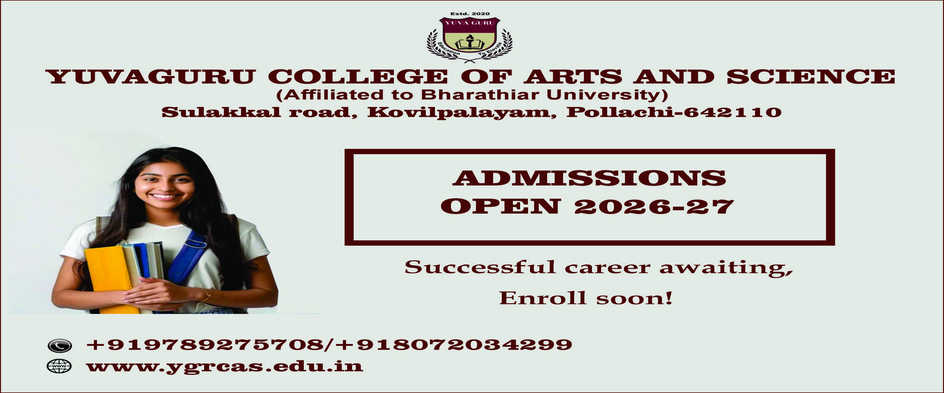Yuvaguru College of Arts and Science, located at Kovilpalayam, Pollachi, was established in the year 2020 under the aegis of the Sri Pranathi Educational and Charitable Trust. The institution is affiliated with Bharathiar University, Coimbatore, and recognized by the Government of Tamil Nadu. Since its inception, the college has been dedicated to empowering rural and semi-urban youth through accessible, value-based, and career-oriented education.